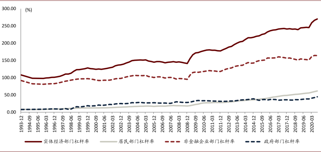 图表: 2020年9月末,中国实体经济部门杠杆率由2019年末的245.4%上升至270.1%,其中非金融企业部门上升12.7ppt,政府部门上升6.4ppt,居民部门上升5.6pp