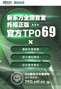 2021年2月4日,作为托福考试官方ETS的战略合作伙伴及中国大陆地区的首席运营商,新东方联合旗下国际教育培训事业部领先全国6个月独家首发了托福官方最新试题TPO69。在新东方国际教育培训事业部发布的《2020托福年度报告》中显示,2020年托福阅读、听力、口语、写作中很多话题内容与官方TPO的话题内容是高度重叠的。此次新题的发布,也为广大考生把握托福考试出题的思路和方向提供了机会。