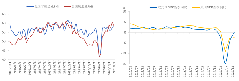 图1:美国PMI和欧美GDP同比