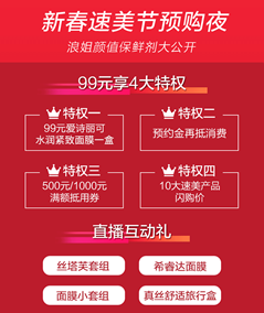 还有一份福利预告重磅来袭:新春速美节预购夜,告诉你浪姐的保鲜秘笈1月29日19:30,99元预约金畅享4大特权:99元爱诗丽可水润紧致面膜一盒;预约金直接抵扣;1000元/500元现金抵用券;10大速美产品闪购价,直播还有超多互动福利等着你来拿!