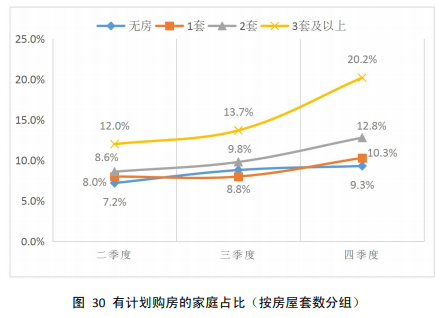 同时,多套房家庭的计划购房比例更高。到2020年内四季度,拥有三套及以上房产的家庭中计划购房家庭占比达20.2%。
