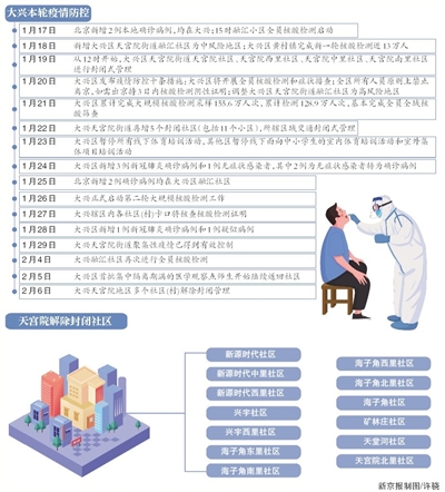 2月6日,大兴天宫院地区新源时代社区、新源时代中里社区、天宫院北里社区等13个社区和紧邻村庄全面解除封闭管理。