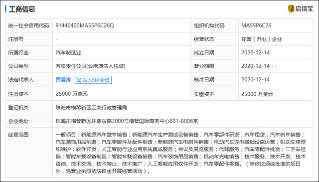值得一提的是,早在去年12月14日,便有一家名为法法汽车(珠海)有限公司的公司注册成立,由FF Hong Kong Holding Limited全资持股,注册资本为2.5亿美元,注册地点为珠海市横琴新区。法定代表人为贾晨涛。