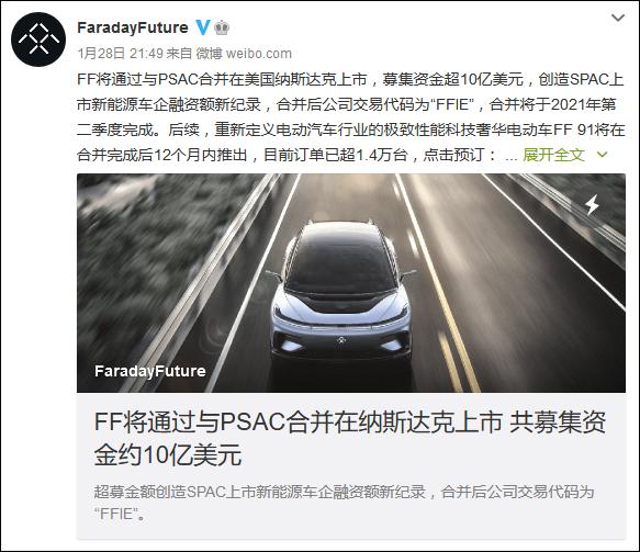 北京时间1月28日夜间,前乐视创始人贾跃亭旗下的FF宣布与特殊目的收购公司(SPAC) Property Solutions Acquisition Corp. (PSAC),就业务合并达成最终协议。合并完成后将在纳斯达克证券交易市场上市,股票代码为“FFIE”,募集资金超过10亿美元,合并将于2021年第二季度完成。