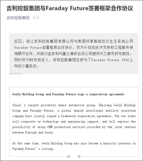 同时吉利控股集团承认,公司作为财务投资人参与了Faraday Future SPAC上市的少量投资。