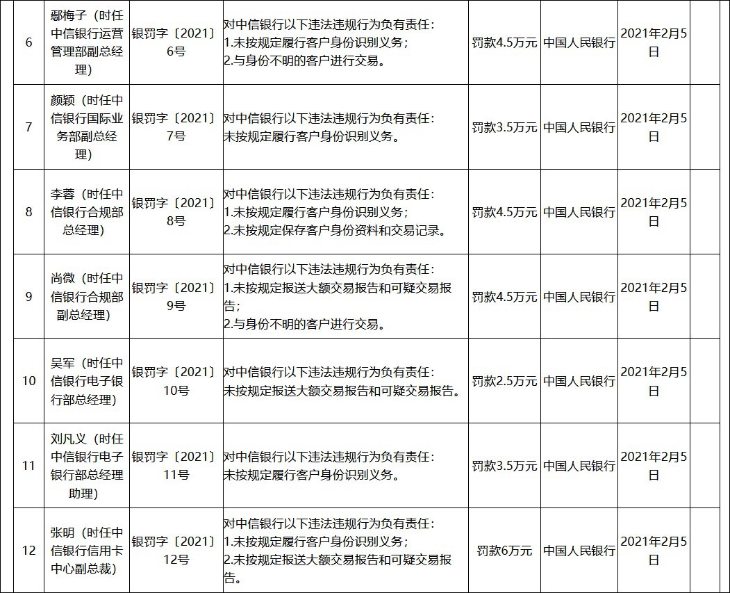2月5日,中国人民银行开出2021年的第一号罚单:中信银行因违反反洗钱相关规定被罚2890万元,此外,14名相关责任人一并收到央行的罚单。
