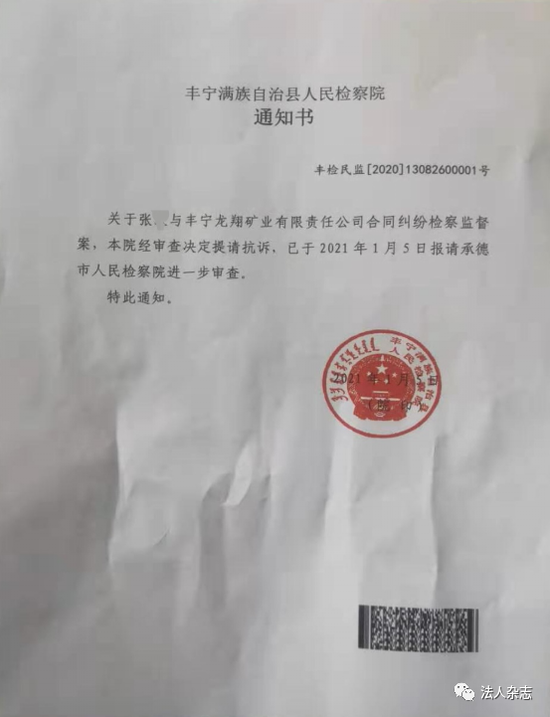2021年1月5日,丰宁县检察院行动迅速,发出丰检民监〔2020〕13082600001号通知,决定对张某与龙翔矿业合同纠纷检察监督案提请抗诉,报请承德市人民检察院进一步审查。龙翔矿业的债务终于走上了辨明真假的道路。