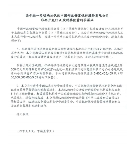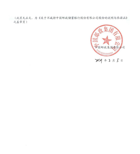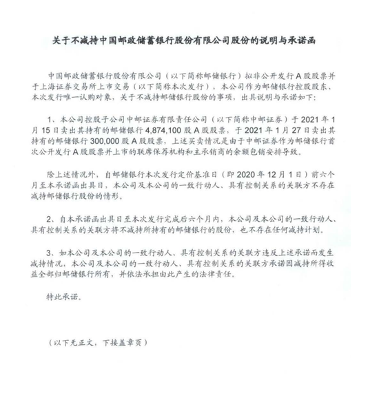 自本承诺函出具日至本次发行完成后六个月内,邮政集团及其一致行动人、具有控制关系的关联方将不减持所持有的邮储银行的股份,也不存在任何减持计划。