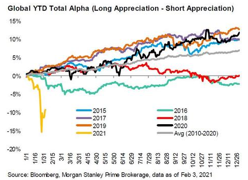 另一方面,散户投资者不需要对任何人负责,只需要对他们自己负责。此外,一种新的散户投资者已经出现。在美国政府提供的免费资金、手头上的空闲时间、进入市场的廉价而便捷的渠道,以及对权威机构日益增长的渴望的多重激励下,散户们上月对“专业人士”造成了严重破坏,后者重新发现,杠杆可以双向发挥作用。一系列散户精心策划的卖空行为迫使对冲基金大幅去杠杆化,主要股指同时下跌3~5%。