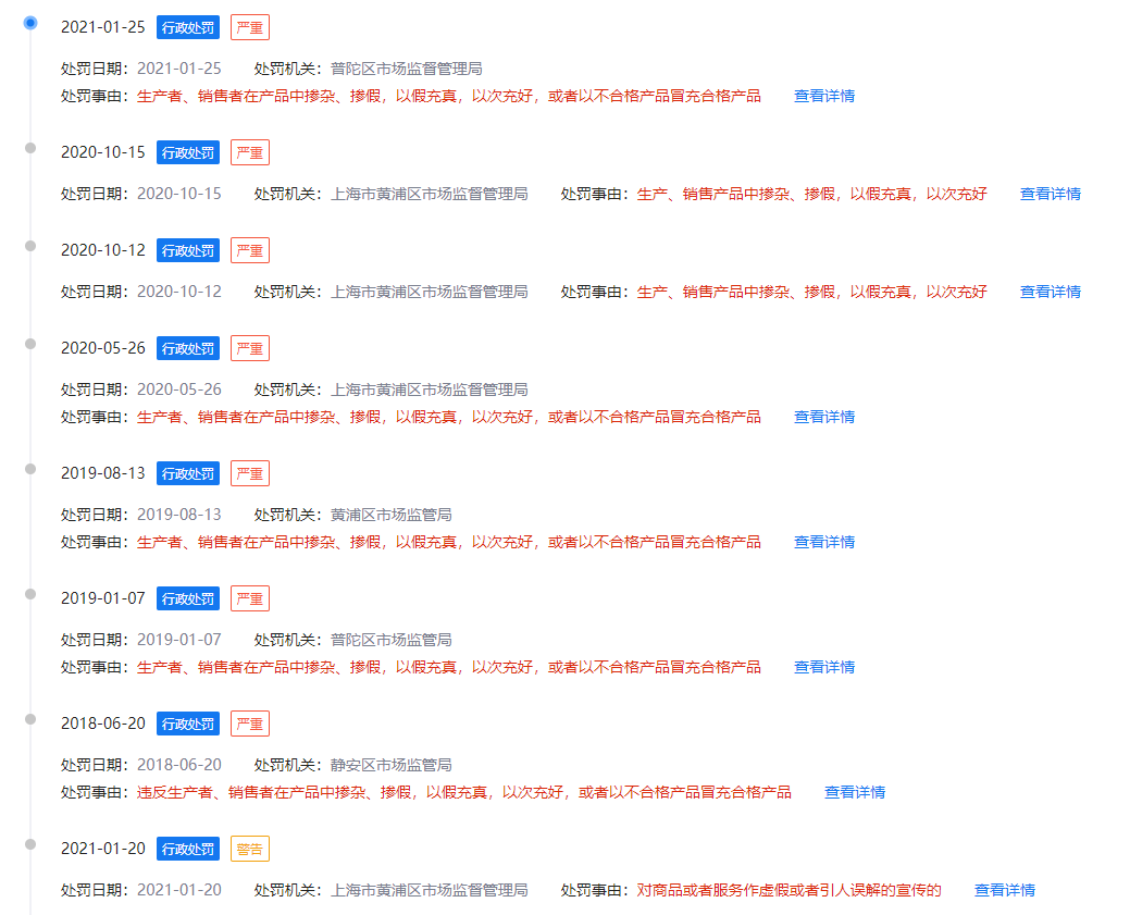 2021年1月25日,普陀区市场监管局决定对该公司处罚款人民币9.6492万元,没收违法所得3.703517万元,没收违法销售的款号为047400的以不合格产品冒充合格产品的衬衫一件。