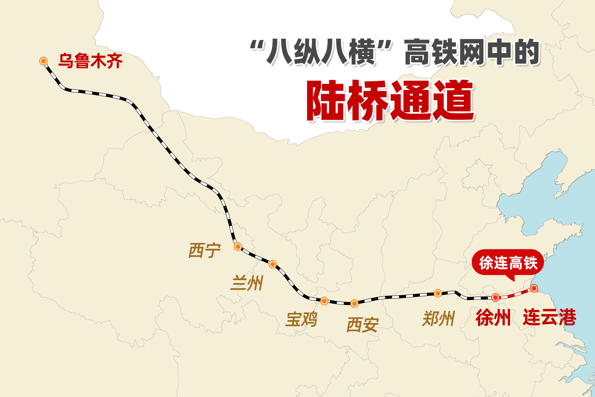 “八纵八横”高铁网中的路桥通道徐连高铁是我国“八纵八横”高速铁路网中连云港至乌鲁木齐通道的最东段,也是最后通车段。徐连高铁建成通车后,与此前已开通运营的郑州至徐州、郑州至西安、西安至宝鸡、宝鸡至兰州、兰州至乌鲁木齐高铁连接,形成全长3422公里的陆桥高速铁路通道,将为新亚欧大陆桥经济走廊发展提供有力支撑。