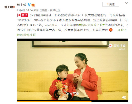 春节临近,各大公司纷纷发布贺岁微电影,2月4日,煌上煌在微博发布新春微电影《一句吉利话》。