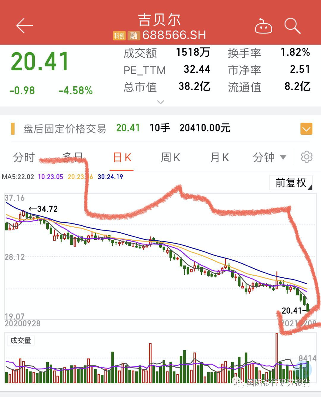 国金证券保荐的第一家科创板公司吉贝尔自从上市以来一直就飞流直下,也顺利跌破了发行价23.68的发行价,现在流通市值只有9.4亿,成交量只有1447万,没基金没有人气已经差不多成为死股。