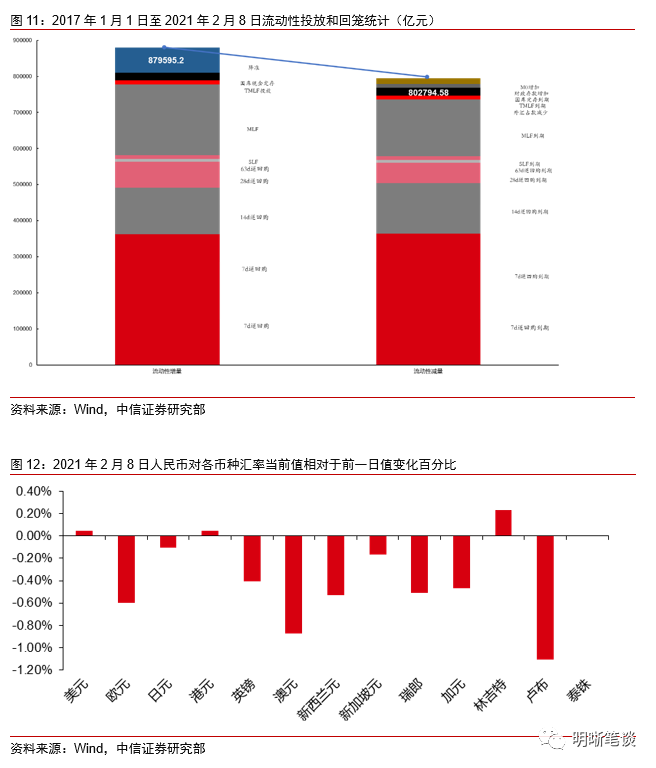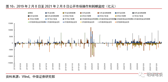 我们对市场流动性情况进行跟踪,观测2017年开年至今流动性的“投与收”。增量方面,我们根据逆回购、SLF、MLF等央行公开市场操作、国库现金定存等规模计算总投放量;减量方面,我们根据2020年12月对比2016年12月M0累计增加16010.66亿元,外汇占款累计下降8117.16亿元、财政存款累计增加9868.66亿元,粗略估计通过居民取现、外占下降和税收流失的流动性,并考虑公开市场操作到期情况,计算每日流动性减少总量。同时,我们对公开市场操作到期情况进行监控。