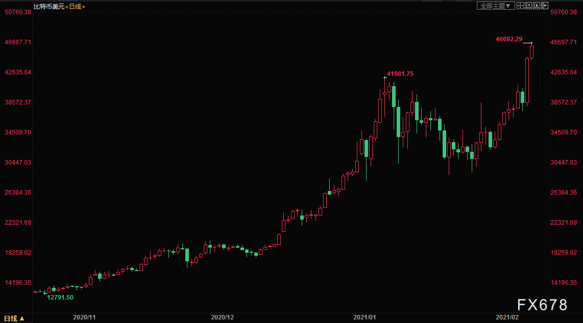 消息一出,比特币短线大涨,一度涨至46692.29美元/枚,达到了新一轮的历史高位!