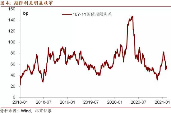 受此影响,1月末期限利差明显收窄。短端利率更易受到政策影响,1年期国债收益率1月末上行至2.67%附近,比去年年末高20个bp左右,而10年期国债收益率上行至3.17%附近,比去年年末高3个bp左右。10Y-1Y期限利差明显收窄至50bp左右,12月中旬到1月末10Y-1Y期限利差是明显的倒V型走势,这反映了过去1个半月左右债券市场的震荡。