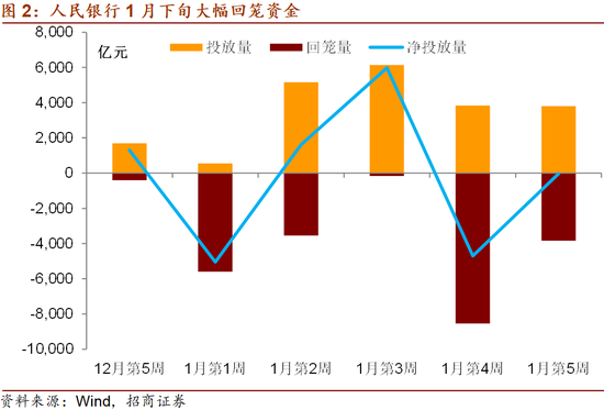 市场先涨后跌是流动性边际紧张的结果。1月12日起,人民银行在公开市场上持续地量逆回购操作,1月第4周央行在公开市场上净回笼资金超过4000亿元。并且,由于债券发行规模下降等原因,市场对1月社融规模预期较为悲观。前者造成短端利率的上行,后者造成A股市场的下跌。