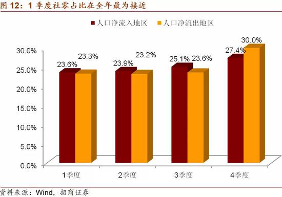 更多人口留在城市过年,可能反而对商品消费有刺激作用。从城乡社零占比数来看,1季度城镇社零占比是全年低点,而1季度农村社零占比并不是全年最高点。换句话说,1季度社零占比是全年的底部,人口迁移对商品消费反而是负面作用。而城镇社零规模是农村社零规模的6倍左右,从这个角度看,就地过年若能提升1季度城镇社零占比0.1个百分点,就足以抵消人口迁移对农村商品消费的抑制作用。