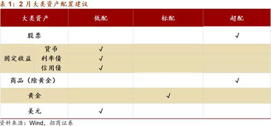 目前我们继续看多风险资产,看空避险资产。2月继续建议超配股票和商品资产,低配债券资产和美元外汇,标配黄金。