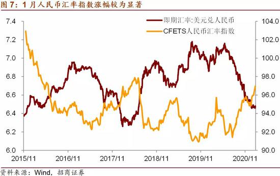 随着美国疫苗大规模投入使用和新一轮财政刺激的预期,1月美元指数暂时止跌反弹,1月末回到90.5附近,全月升值0.6%。美国10年期国债收益率重回1%以上,1月末读数为1.11%,比12月上行18bp,中美利差收窄14bp。尽管如此,1月人民币汇率依然维持强势,美元兑人民币汇率突破6.5关口,全月升值1.2%至6.46左右,人民币汇率指数涨至96.5%,比12月末升值1.8%。人民币保持强势的原因主要有两方面:一是人民币走强半年后,私人部门结汇意愿明显提升,去年12月银行结售汇顺差超4000亿元;二是外资进一步加大配置人民币资产的步伐,1月陆股通和银行间市场共流入外资2602.51亿元,连续两个月超过2000亿元。