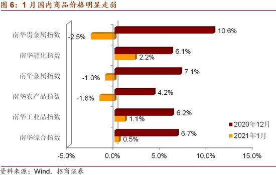 1月国内商品价格涨势明显放缓,全月南华商品指数仅上涨0.5%。国际原油价格反弹继续拉动能源指数上涨,但涨幅从上期的6.1%收窄至1月的2.2%,供需错配下,工业品指数上涨1.1%,涨幅较去年12月收窄5.1个百分点。贵金属、农产品、金属指数在1月均有不同程度的下降,尤以贵金属跌幅2.5%最为明显。主要原因在于近期美国疫苗接种率符合预期,为全球最高的国家,带动美元指数和美债收益率集体上行,对黄金价格造成较大压力。商品价格走弱可能也反映了春节临近,国内工业生产进入淡季的季节性特征。并且,就地过年的经济影响存在较大的不确定性,在此背景下,国内商品价格的调整也在情理之中。