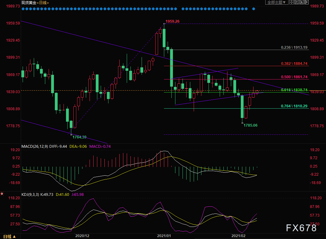 KDJ金叉,MACD双线交汇,多空势能即将迎来转折。周二金价实现三连涨,但连续地冲高回落打击了部分多头的信心,周三能否续涨对后市多头的潜力发挥有相当的参考作用。目前来看,多头涨势维持良好,下一组力位关注1850一线阻力及50%斐波回撤位1861及38.2%回撤位1884。如果能成功收复1861关口,则多头有希望变被动为主动,后市将打开更大的上升空间。如果日内明显承压于61.8%回撤位1838附近,则可能意味着短期反弹行情的结束,后市将延续跌势,支撑位下看到1810、1785及1764。