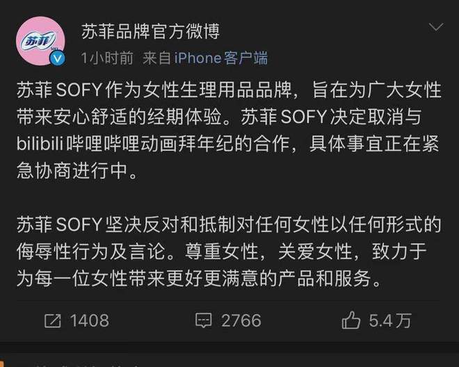 此外,苏菲品牌官方微博2月10日宣布,苏菲SOFY决定取消与bilibili哔哩哔哩动画拜年纪的合作,具体事宜正在紧急协商进行中。苏菲强调,苏菲SOFY坚决反对和抵制对任何女性以任何形式的侮辱性行为及言论。尊重女性,关爱女性,致力于为每一位女性带来更好更满意的产品和服务。