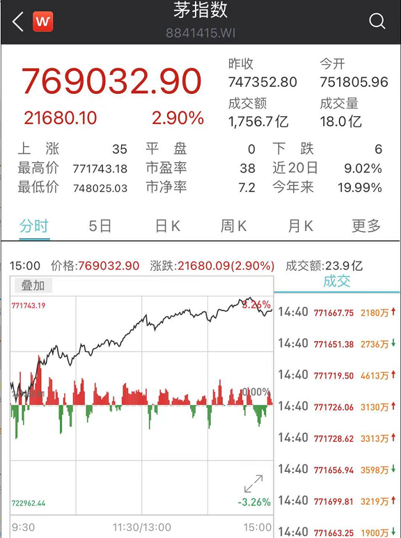 目前,茅台市值超过3.2万亿,按照今天最高价计算,两个交易日市值暴增近2800亿。