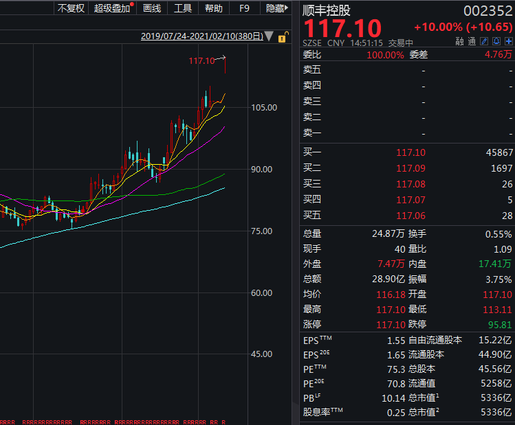 截至收盘,顺丰控股涨停,报117.1元/股,市值达5336亿元。上一交易日收盘,顺丰控股市值4850亿元,市值暴涨486亿元。2021年以来股价涨幅超32%。