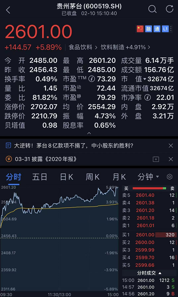 此外,贵州茅台还再获券商提高目标价。今日早间,中信证券发布研报称,品牌和渠道持续进化下,茅台核心壁垒不断加厚。短期看,非标产品望率先催化增长提速,维护普飞价稳夯实潜在提价可能,1-2年维度期待更多增长势能释放。更长维度看,公司量价稳增基础扎实,具备长维度业绩增长的高确定性,望充分享受估值溢价。2021春节动销不断凝聚更强共识,白酒板块投资依然乐观,茅台攻守兼备,更多催化下有望引领行业上涨。公司市值站上3万亿后,仍有广阔长期空间,上调公司1年目标价至3000元,维持“买入”评级。
