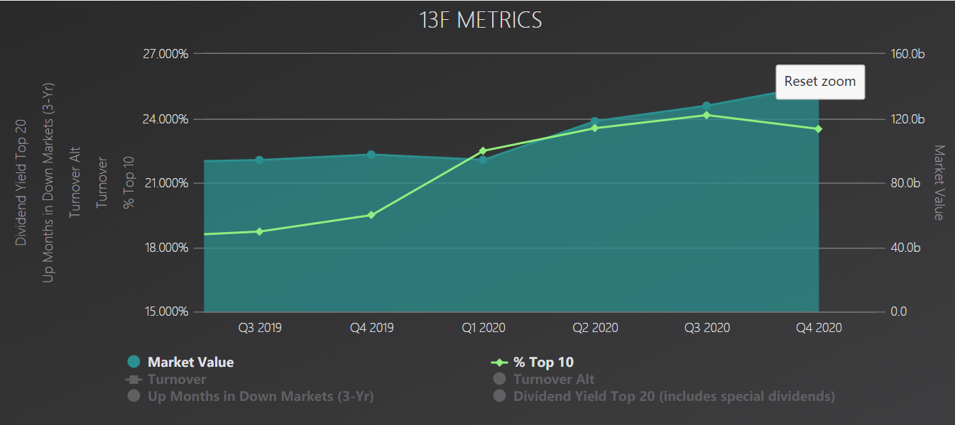 瑞士央行提交的13F文件显示,该行在2020年第四季度持仓总市值为1407.42亿美元,前十大持仓标的占比高达23.5%。相比之下,2020年第三季度该行持仓总市值为1278.74亿美元,前十大总仓标占比为24.15%。