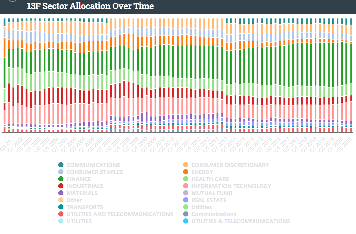 在前五大加仓标的中,除了菲利普66公司之外均为金融板块,富国银行对ETF资产的喜爱尤为明显。这也符合该行一直以来的作风,统计显示,自从本世纪初开始,富国银行的持仓标的中,金融和科技板块所占的比重一直相当之大。