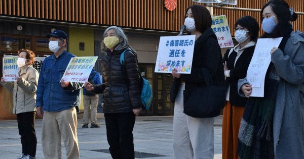 6日,日本岛根县松江市民众手持标语牌,要求森喜朗辞职。(日本《每日新闻》网站)