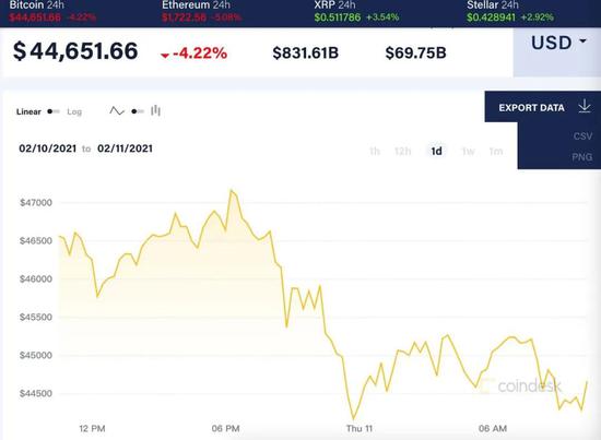 大麻股飙升的同时,连续冲高的加密货币却遭遇回调。Coindesk平台数据显示,比特币跌破45000美元关口,跌幅逾4%。