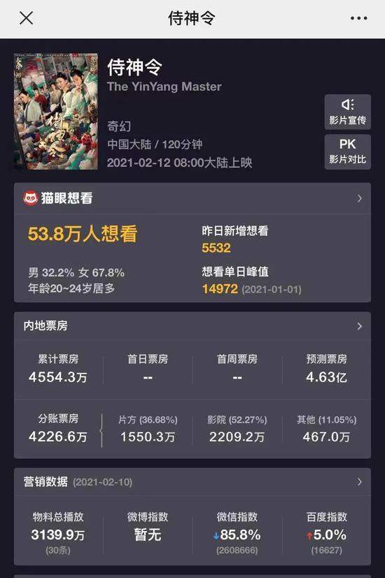 从最新票房来看,目前《侍神令》累计票房4554.3万,综合票房占比4.0%,暂排名第五。