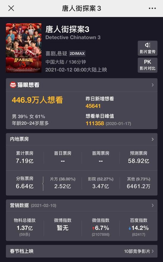 猫眼专业版的数据显示,《唐人街探案3》在2月12日上映首日票房遥遥领先,成为春节档的最大热门,累计票房7.19亿元,预计其总票房将达58.92亿元,近三倍领先于排名第二的《你好,李焕英》。