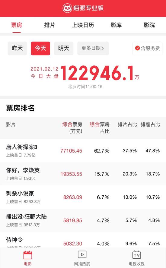 根据猫眼专业版数据显示,截止2月12日早上11点,今日大盘达12.29亿。其中,《唐人街探案3》共446.9万人想看,预售总票房超7亿。预测总票房58.92亿。《你好,李焕英》116.2万人想看,预售票房1.74亿,预测票房23.16亿。《侍神令》53.8万人想看,预售票房4451.3万,预测票房4.63亿。