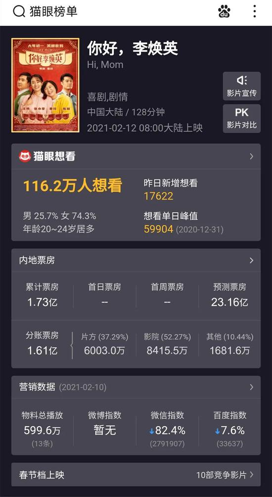 截至2月12日早上八点。从预售票房来看,排名第二的《你好,李焕英》和排名第一的《唐人街探案3》相差近一倍,《你好,李焕英》的预计票房在23.16亿。而电影拍片也相差一倍,在首日拍片中占比20.1%。值得注意的是,目前国内票房超20亿的电影只有十八部,远超上映前的对标电影《夏洛特烦恼》。如果能一举拿下票房榜前二十,《你好,李焕英》稳赚不赔。