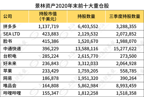 同期,景林资产的前十大重仓股也多为中概股,比如拼多多、中通快递、好未来、网易和唯品会等标的。
