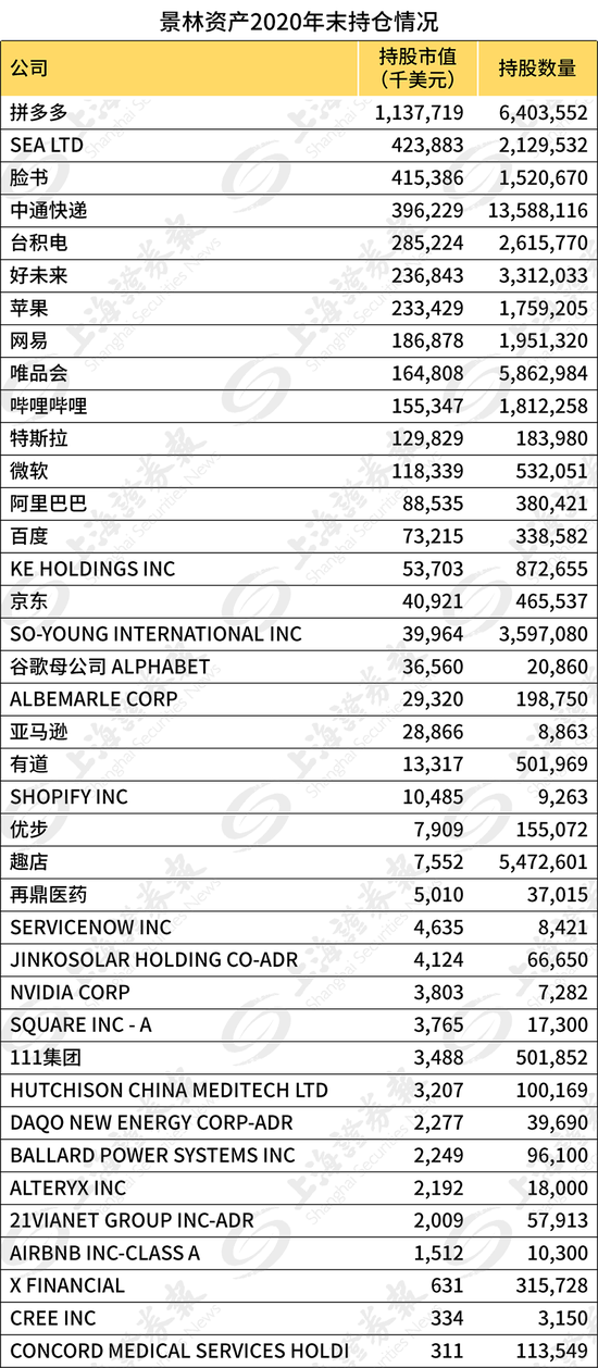 2月13日,高瓴资本和景林资产在美国证券交易委员会(SEC)公布了2020年末的美股持仓情况。