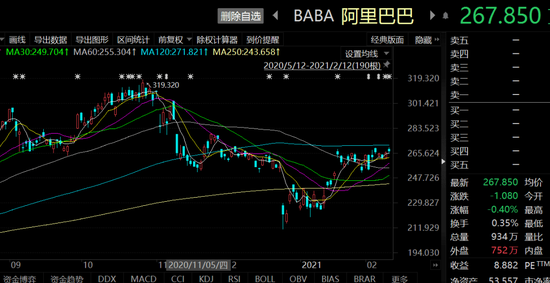 Choice数据显示,阿里巴巴去年四季度股价跌幅超20%。