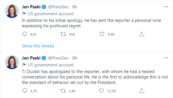 【环球网报道 记者 侯佳欣】尽管美国总统拜登在就职当天就曾对白宫工作人员发出“不尊重同事就解雇”的警告,据“今日俄罗斯”(RT)消息,白宫副发言人TJ·达克洛威胁政客新闻网记者“我会毁了你”之后,却只受到停职处罚。
