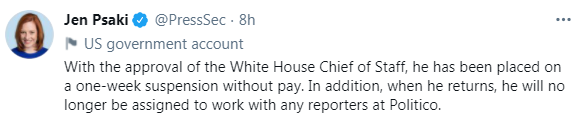 普萨基补充说,他已经被无薪停职一周。他回来后也不会在与政客新闻网的任何记者一同工作。↓