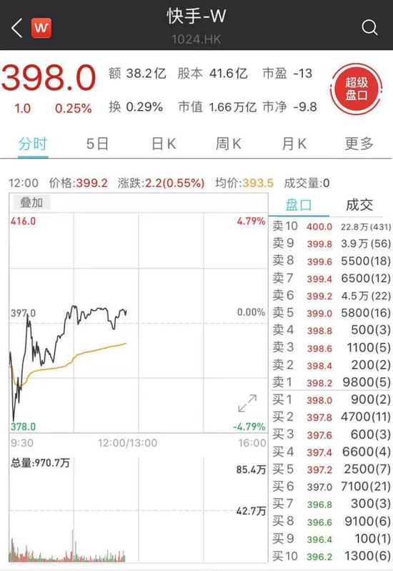 除夕当天,快手盘中一度突破400港元,截至收盘,报398港元/股。