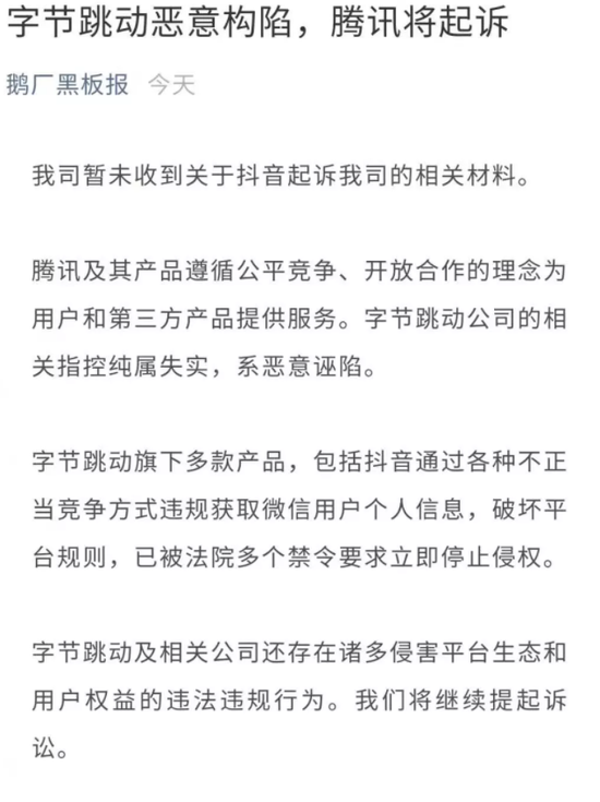 对此,腾讯晚间发布声明回应,称相关指控纯属失实,系恶意诬陷。同时,腾讯称,字节跳动及相关公司还存在诸多侵害平台生态和用户权益的违法违规行为,将继续提起诉讼。