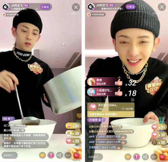 别看符龙飞是男团出身,在直播间里一点儿偶像包袱都没有,不仅做饭的时候像模像样,做好以后还秒变吃货,在镜头前捧着大盆吃鸡,馋的直播间网友不断刷屏:“我的外卖还没到呢!”
