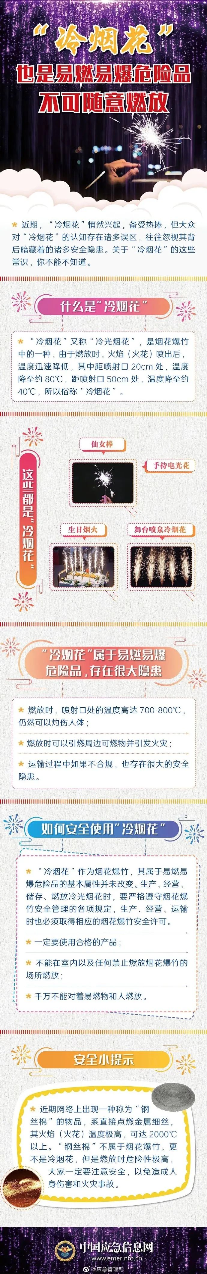 特别是针对冷光烟花兴起的情况,国务院安委办、应急管理部强调,冷光烟花虽然火焰温度较低、烟雾较少,但喷射口温度仍高达700-800℃,可灼伤人体、引燃物品,作为烟花爆竹,其易燃易爆危险品的基本属性并未改变。生产、经营、储存、运输冷光烟花时,仍要严格遵守有关烟花爆竹安全管理的各项规定,必须取得相应安全许可,严禁以任何形式变相生产、销售。