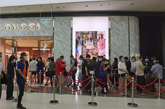 当天早上十点,三亚海棠湾国际免税城刚开门营业不久,入口处已聚集了数十位消费者在工作人员的引导下扫描健康码、等待安检。