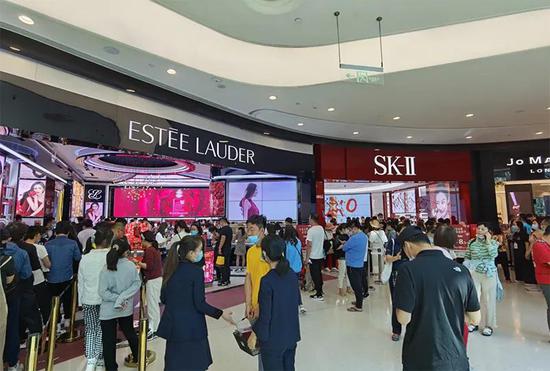 雅诗兰黛、SK-II等店铺买单的队伍已排至店外