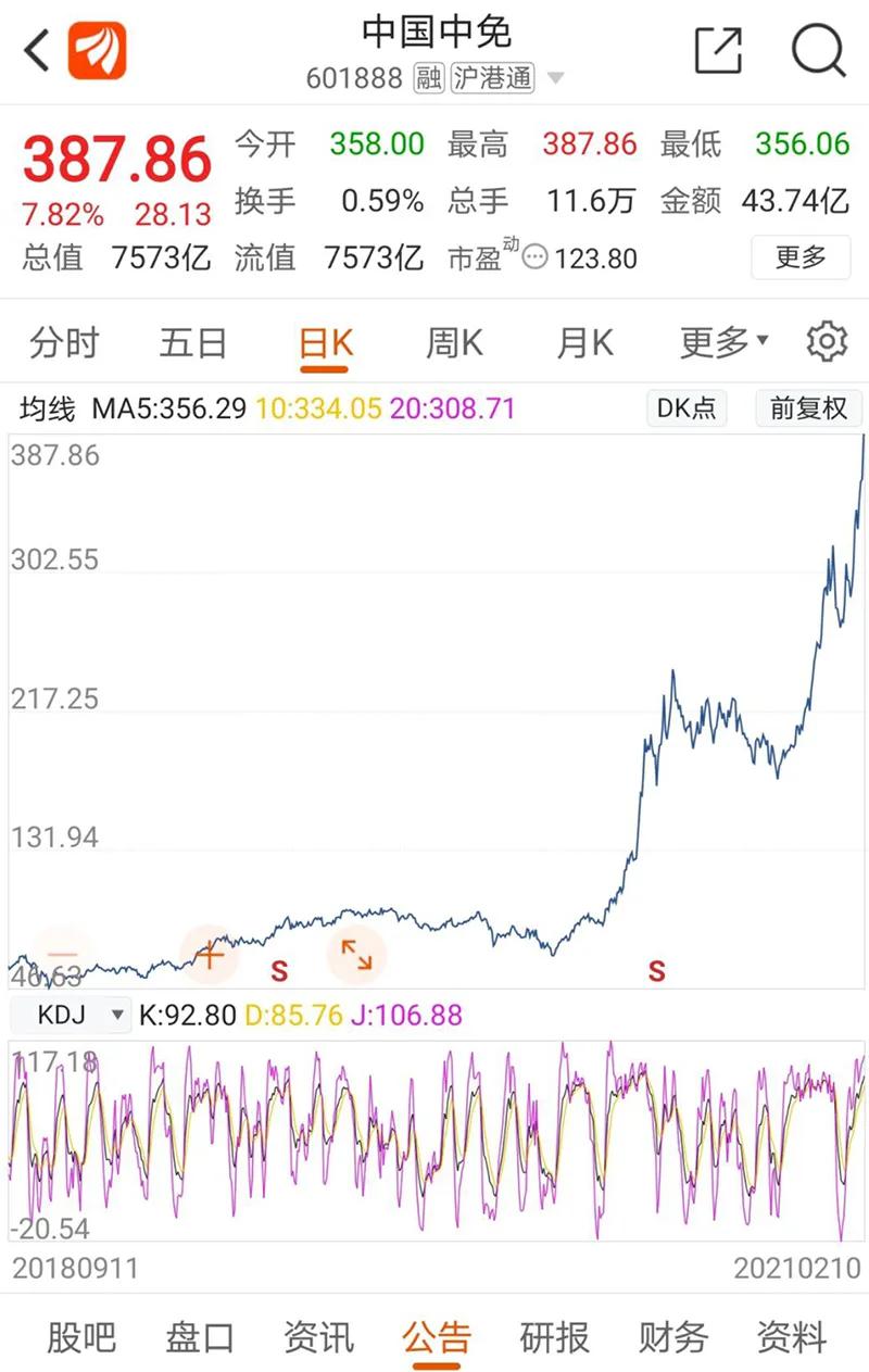 中国中免的股价也在春节假期前最后一个交易日创下新高,截至2月10日收盘,中国中免的总市值已达7573亿元。